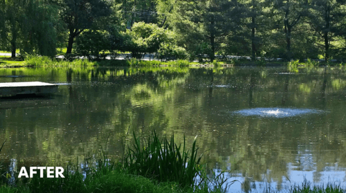 Many people who use Captain XTR say they see the algae dying rapidly. Within a matter of minutes to hours after applying Captain XTR, they can see impacts to the algae. For example, a pond full of nuisance algae won’t stand a chance after one of these applications. Another case is this stormwater pond full of thick, filamentous, nuisance algae. And again, a couple weeks after applying Captain XTR it cleared up. You can take out a lot of those thick, nuisance, mat formers following a single application of XTR.