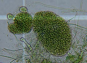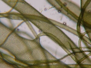 The first type is pithophora. It’s a green filamentous algae. And you can grab it, you can squeeze it out. It almost looks like a cotton ball. This is also known as cotton algae or horsehair algae. It does have little frills that come off of it, meaning it's branched. And often you can see little tiny dark specks. Those are the akinetes or the resting stage cells. Cladophora is very similar to this species as well.