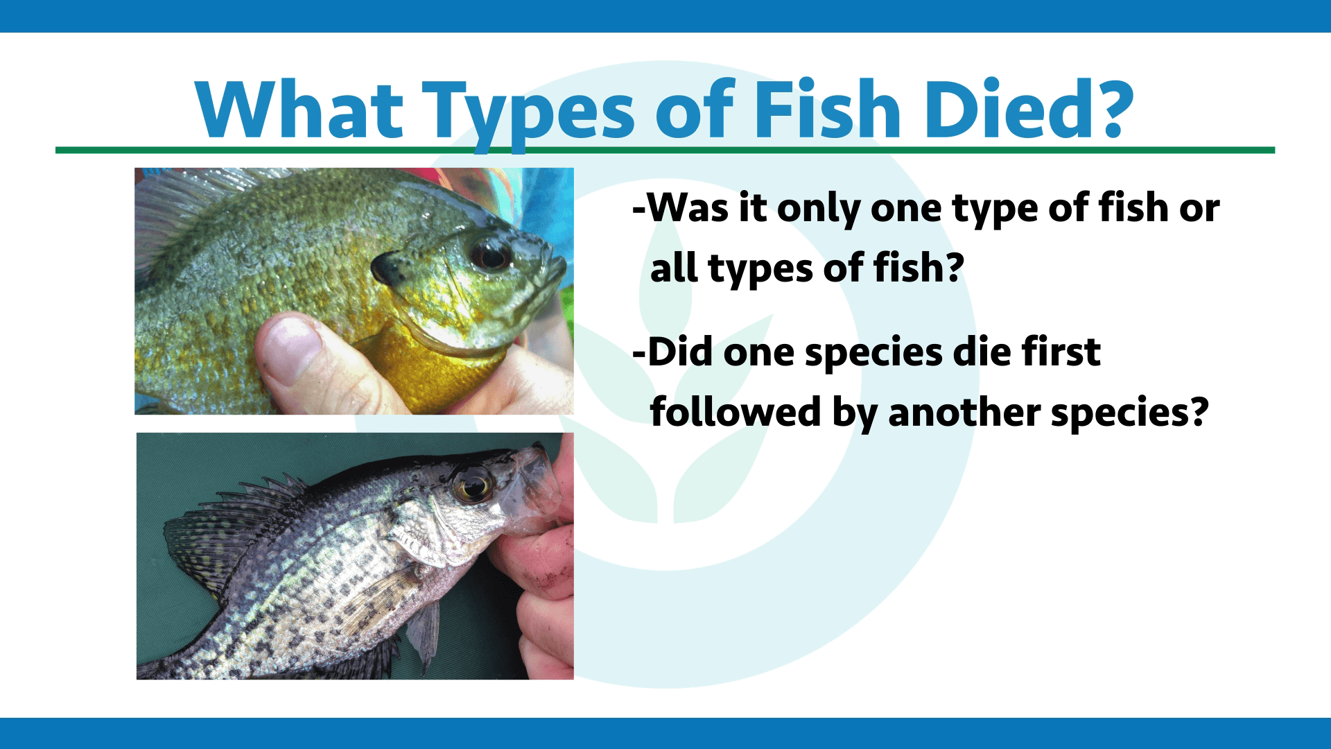 Was it just bass or blue gill, or was it all different types? Did one species or type of fish die first followed by the next one? It’s very important to know the types of species that were affected.