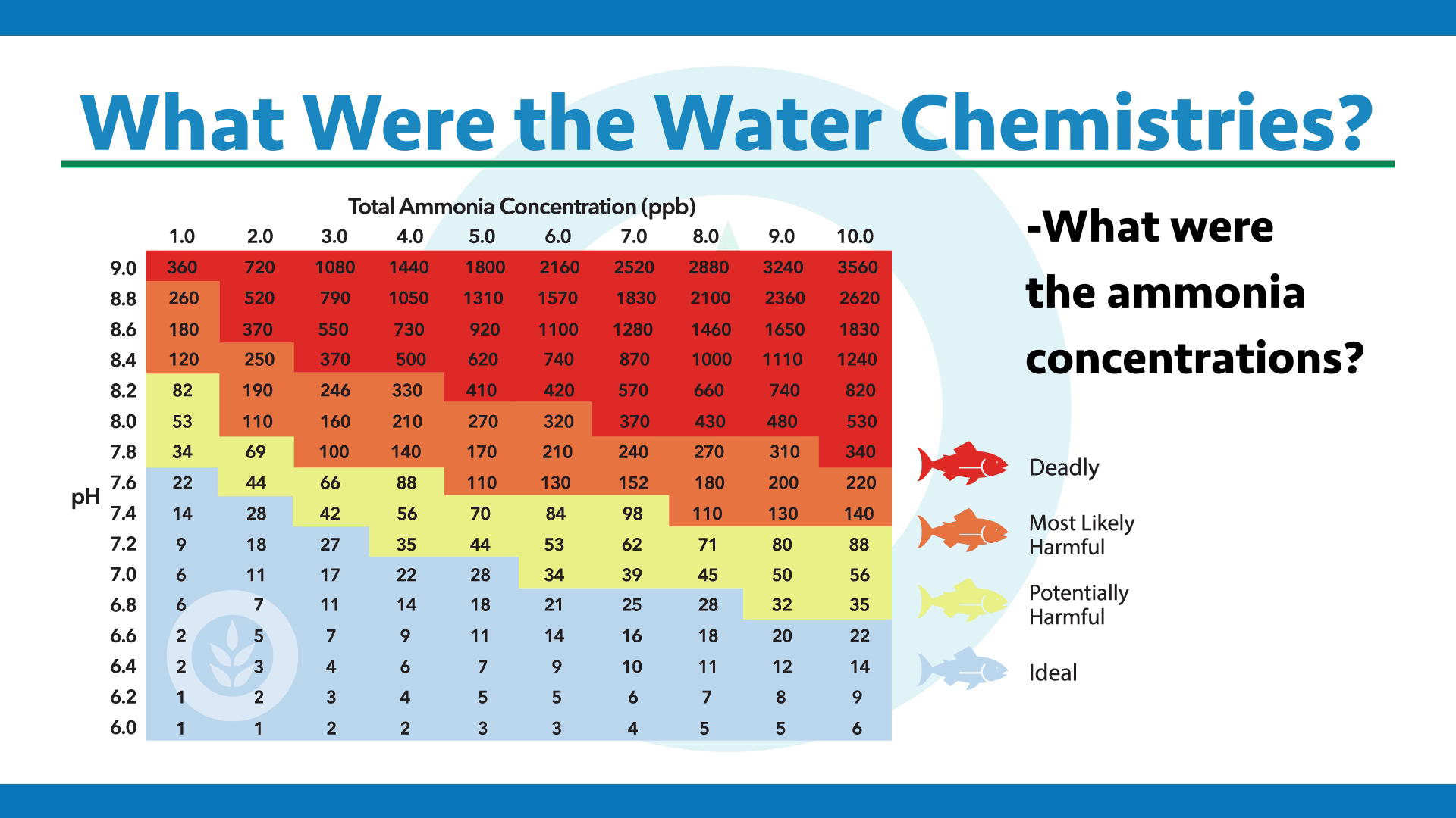 There are many different other water chemistries that are important to understand. Ammonia for example: if you have a lot of fish, high nutrient concentrations, or if you feed your fish a lot, it could elevate ammonia concentrations. This is important to measure and look at because high pH and high ammonia levels can cause toxicity and stress to fish as well.