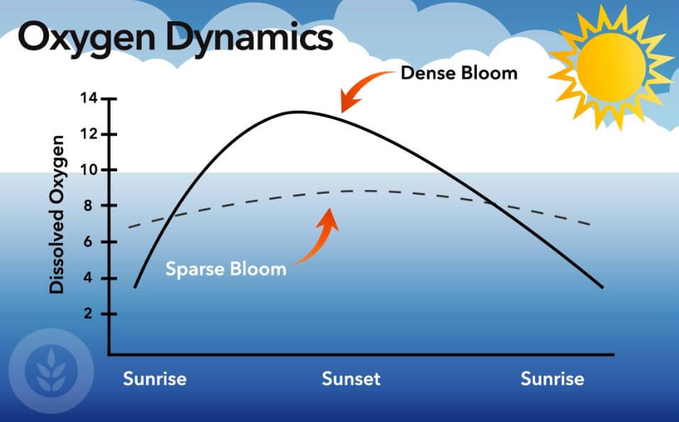 What type of algae you have? This is very important to note. Some types of algae are good, but even those good algae can get too dense. They can get overpopulated and they can alter water chemistries. These algae even respire at night, so they can take up dissolved oxygen. And even good types of algae can, if they get too dense, can cause dissolved oxygen depletion.