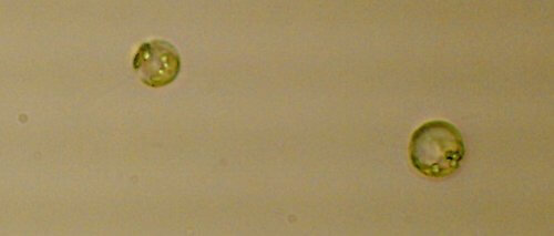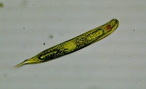 Euglena are flagellated cells. They have two flagella that can swim around, but they also have this pigmented eye spot, so they can sense different light intensities. They can see and they can move throughout the water. Oftentimes they will go into a resting state cyst.