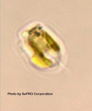 Let's get started with our first algal group, known as the Golden Algae. That's just based on the coloration, or the pigments that they contain. So don't waste your time trying to collect and sell them! It's just the color of the algae and it is very small, around 10 microns long in the water. The primary species of concern here is called Prymnesium parvum. But he does have an ugly cousin called Chrysochromulina parva.