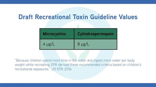 The EPA actually states that children are at a higher risk, both in recreational waters and in drinking waters. You can see that very low levels of these toxins can impact humans, specifically children if present in the water.