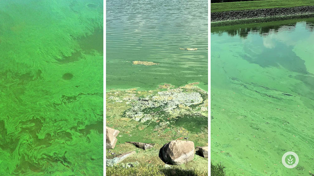 Don't get Botryococcus (right) confused with the nasty toxic cyanobacteria scums out there (left), though. It can be a bit unsightly, but it's actually a pretty cool and beneficial algae for a system.
