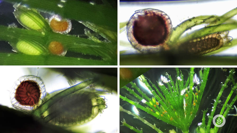 It does have prominent male and female reproductive structures which are usually together at a node of a cell. The antheridia are the males, and they're usually orange in color. The female has this big oogonia which contains the egg cell. So the male antheridia sperm cells come over, fertilize that egg cell, and form a new zygote, which is usually black and acts as that seed structure to support future growth of Chara.