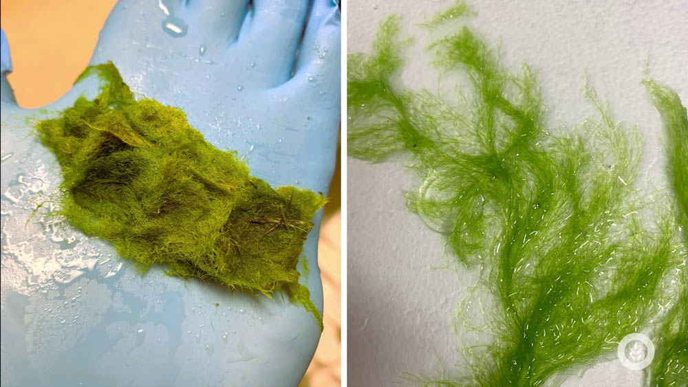 Welcome to this very important episode of Algae Corner on the botulism bird killer: Cladophora. Cladophora is a branched, cottony, filamentous green alga that can form dense mats. It's usually a little brighter green than Pithophora and has unique looking branching that you can see in these photos.