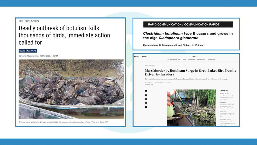 What about Cladophora and botulism bird deaths? Basically, these Cladophora mats can house the bacterium named Clostridium botulinum and actually create an environment that is more anaerobic. It provides more organic matter that they can use to thrive. And perhaps under that mat itself, they cause these spores to come out. That bacterium thrives in these Cladophora mats and produces something called type E botulism, which impacts waterfowl, fish, amphibians, and even some types of mammals. Type C botulism is less common, but it can also be produced in certain locations.
