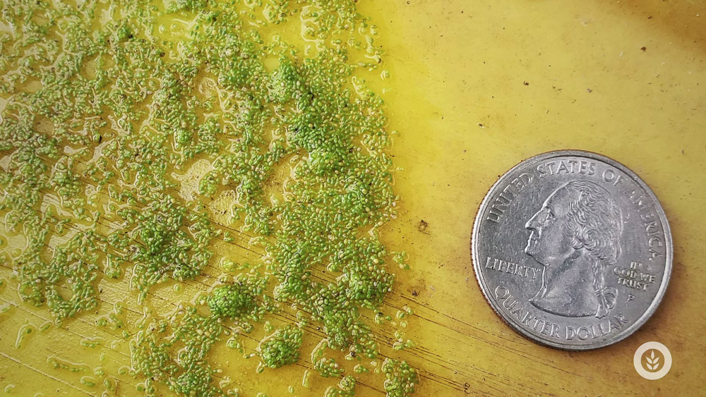 The plant itself averages 1/42” long and 1/85” wide, or about the size of a pinhead. It can weigh 1/200,000th of an ounce, or about two grains of table salt! They're very hard to see with the naked eye when they aren’t in a big group. If you tried to fill even a small thimble with them, it would take about 5,000 plants to fill that up – that’s how small these plants are.
