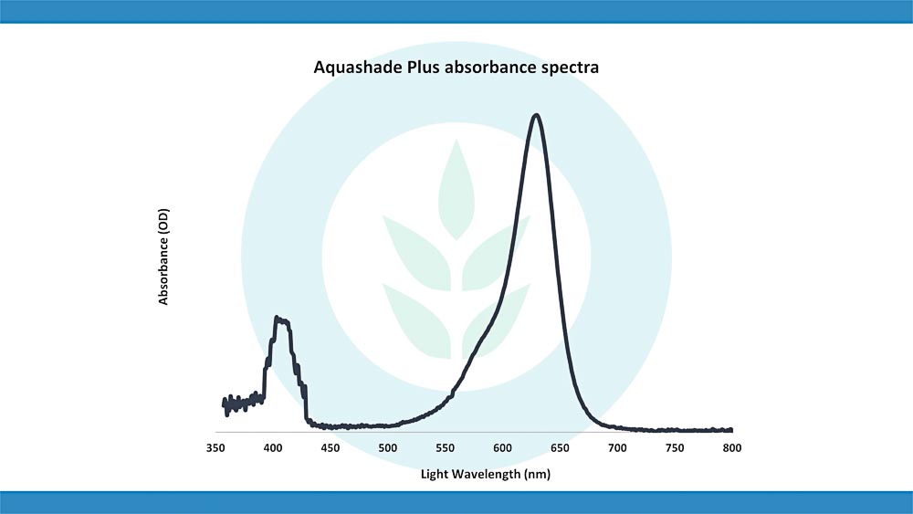 The specific blend and concentration of dyes in Aquashade are designed to align and block specific key wavelengths of light that algae need. Here’s an exciting visual to illustrate this… this is the chlorophyll A pigment. This is present in most types of algae and cyanobacteria in the dominant light harvesting pigment. It is responsible for all the green you see out there because it reflects those wavelengths of light while absorbing different spectrums of light.
