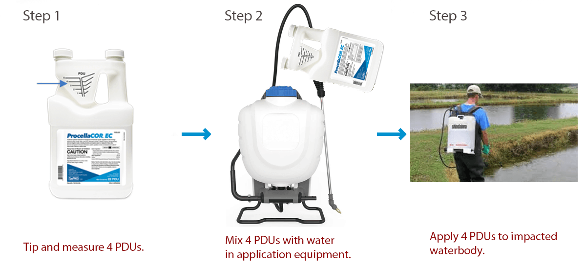 A PDU is an amount of ProcellaCOR needed to treat either 1-acre foot of water for in-water applications or 1 surface acre for foliar applications. The PDU system stewards an improved treatment prescription, simplifies calculations and dosing, similar to medicinal prescriptions/directions.
