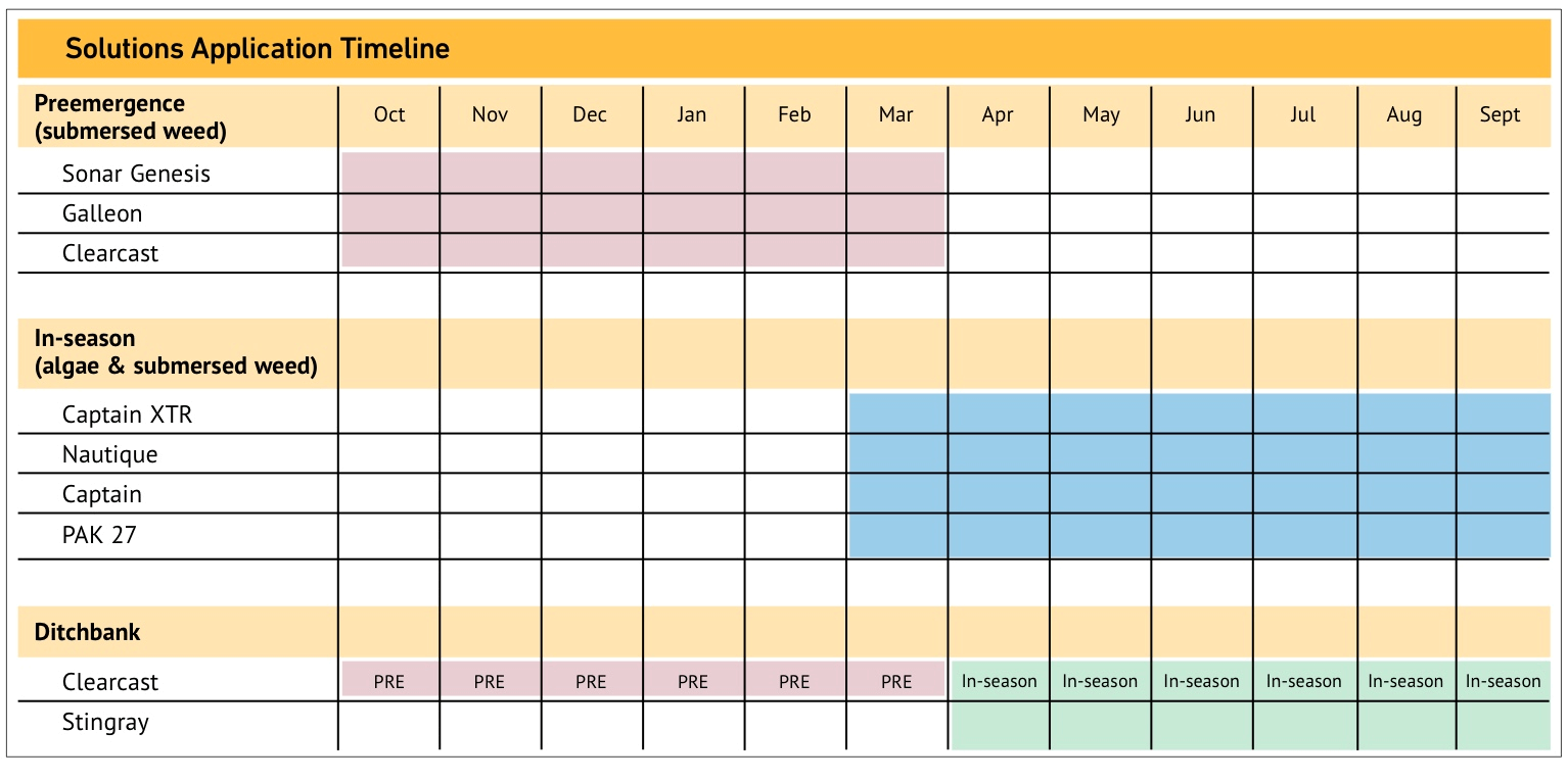 Implement a preemergence program for submersed weeds using a combination of Sonar Genesis, Clearcast, or Galleon. Implement preemergence ditch-bank programs using Clearcast with other pre-emerge products, i.e. diuron or others.