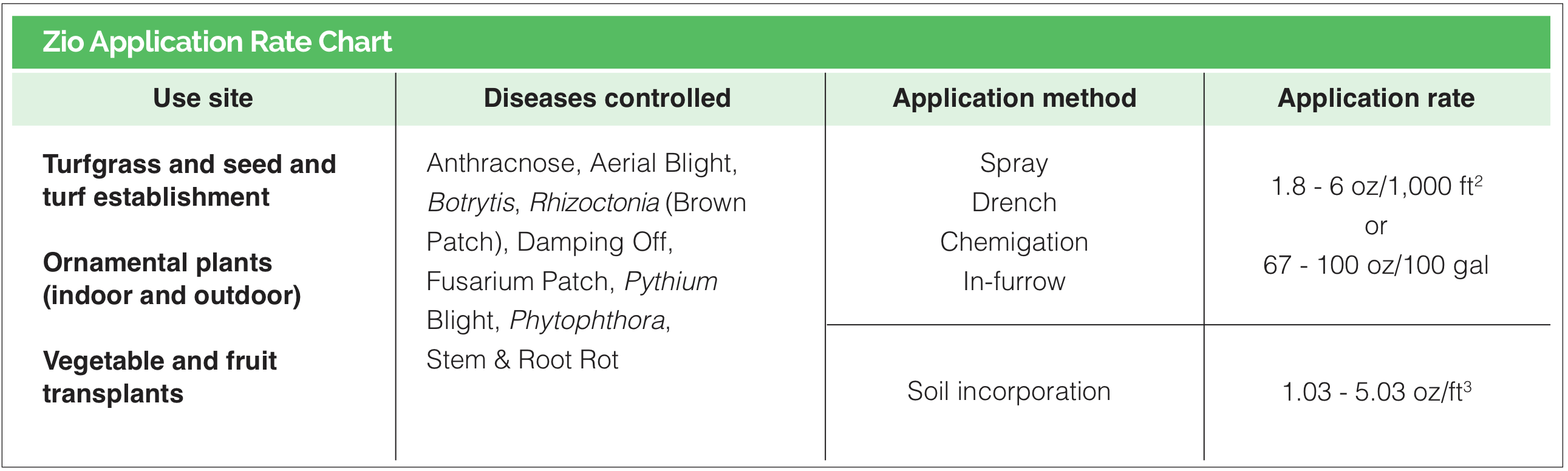 Zio is formulated as a 50% wettable powder (WP) and can be applied by chemigation, soil drench, foliar spray, or media incorporation. The label allows for applications to turfgrass (including turf and seed establishment), ornamental plants (indoor and outdoor), and vegetable and fruit transplants. Do not allow product to freeze or store in areas subject to excessive heat.