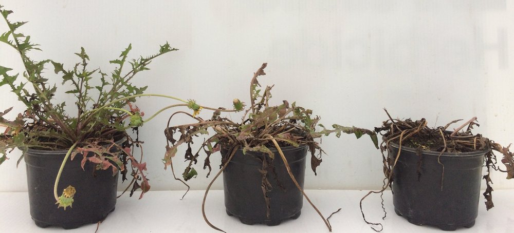 Photo: Left to right - Nontreated, Trimec, and Octane plus Trimec. Photo taken 20 days after application. Notice the dandelion plant treated with Trimec alone is not completely controlled while the dandelion plant treated with Octane plus Trimec has reached complete necrosis.