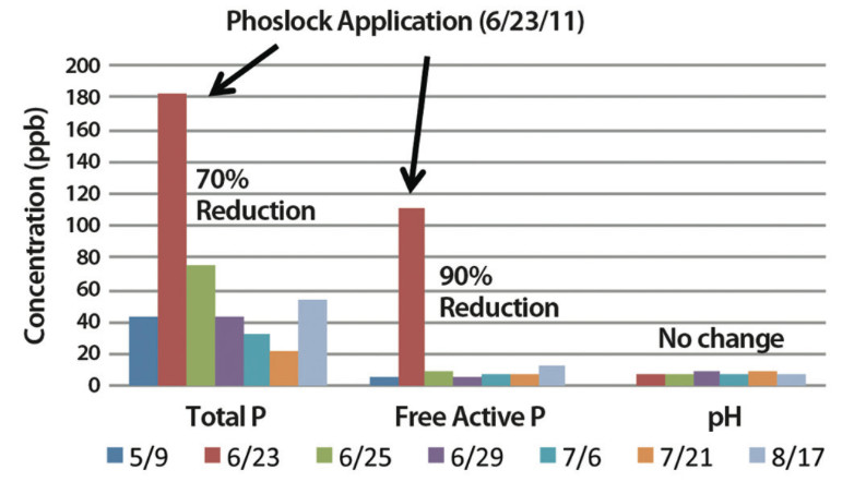 Within 48 hours of the Phoslock application, Free Reactive Phosphorous (FRP) levels dropped below detection (>10 ppb) and remained below detect through August 17, 2011. Total phosphorous levels were measured at 182 ppb prior to application, dropped 58% to 76 ppb within 48 hours following application and two months later remained at levels 70% lower than pre-application conditions. The phosphorous reduction trends following the application of Phoslock in this pond are consistent with the phosphorous reduction and subsequent water quality improvements documented with Phoslock programs in Europe, Asia and Australia.